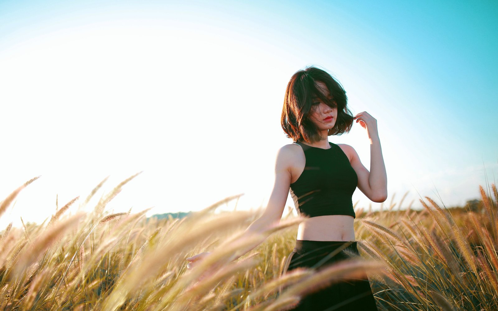 Beautiful Asian Girl in Black Top in a Field - 2880x1800
