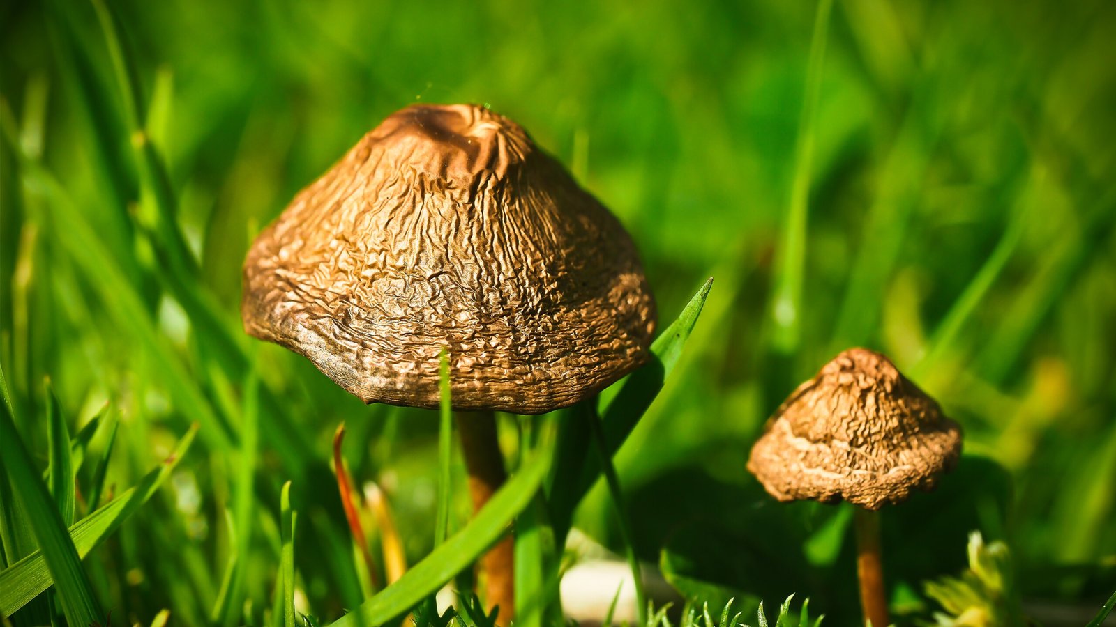 Mushroom and Green Grass on the Meadow Close Up - 2560x1440
