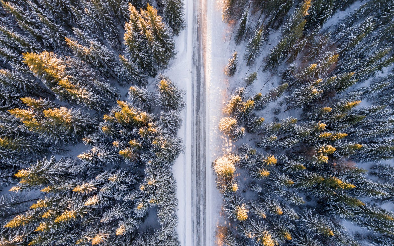 Aerial View of Winter Pine Forest and Road - 2560x1600