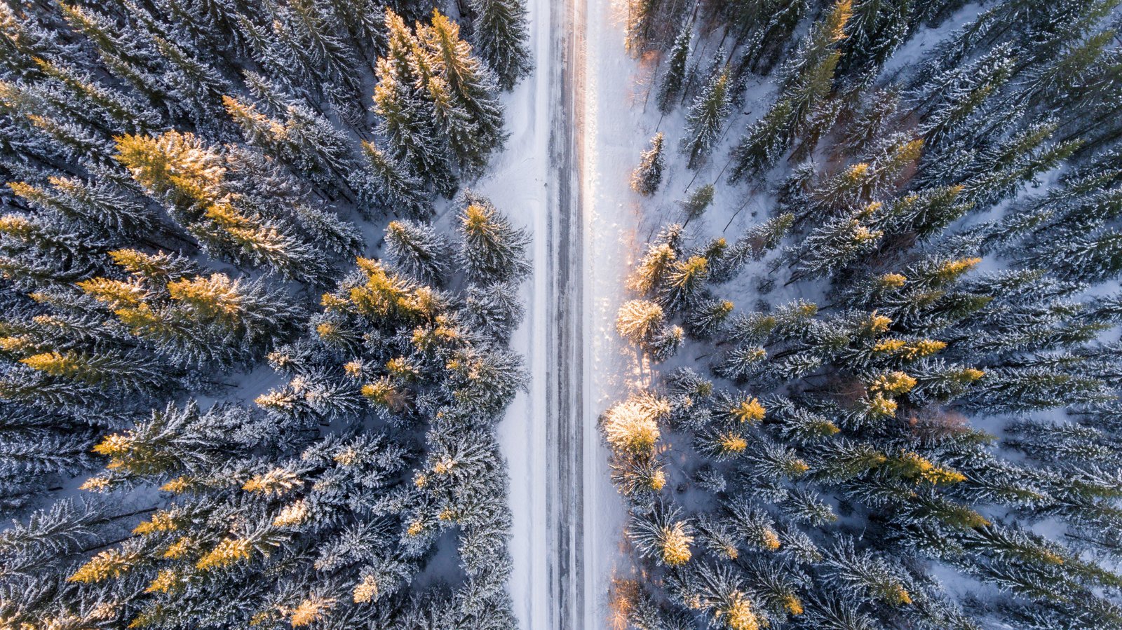 Aerial View of Winter Pine Forest and Road - 3992x2242