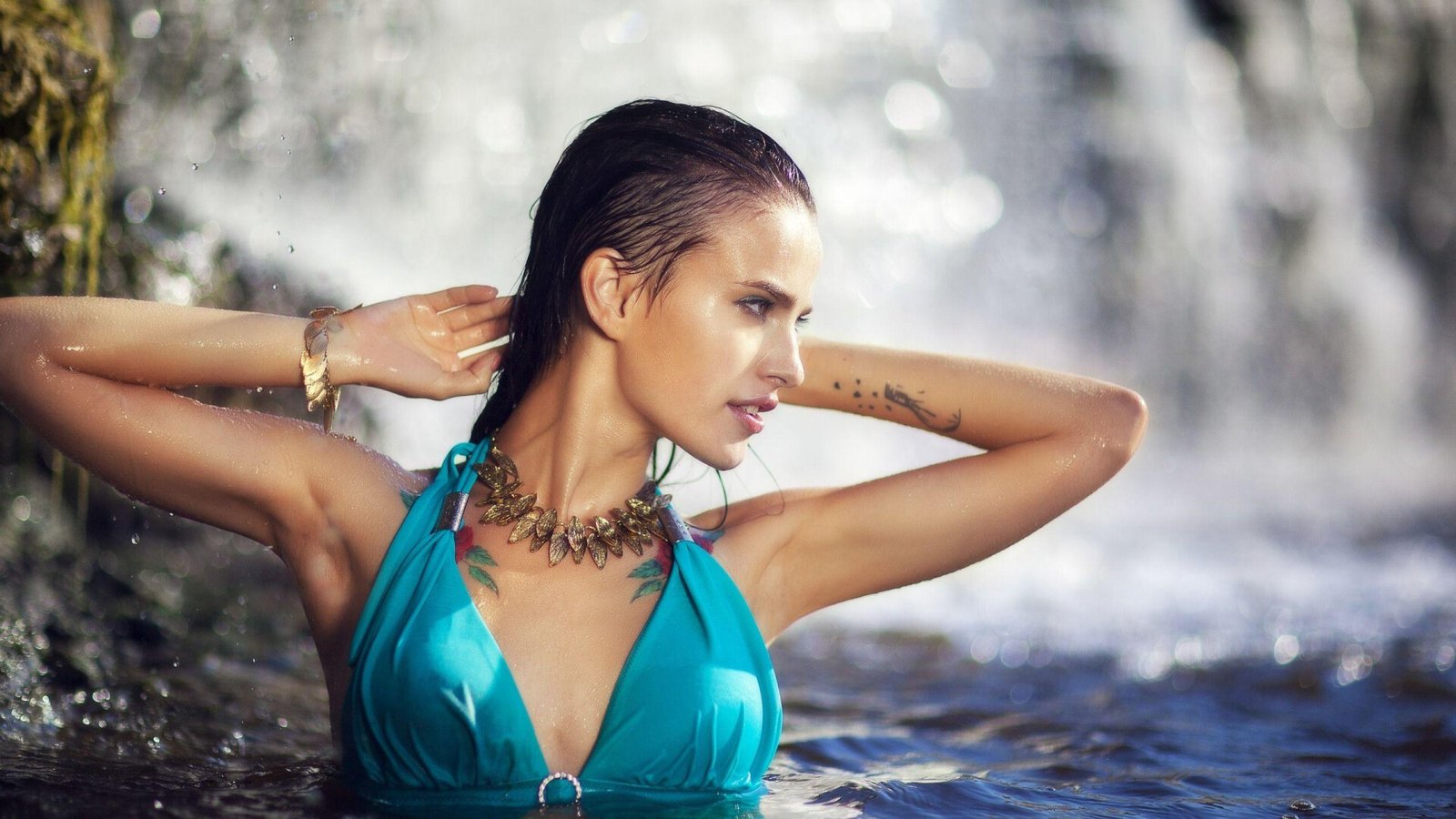 Beautiful Sexy Girl in Blue Dress and in Waterfall - 1920x1080 (1080p)