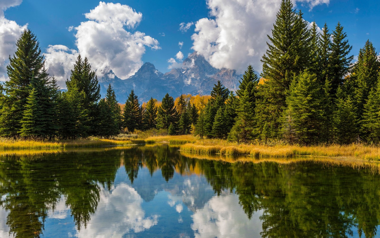 Green and Yellow Autumn Trees with Lake and Mountains Between - 1920x1200