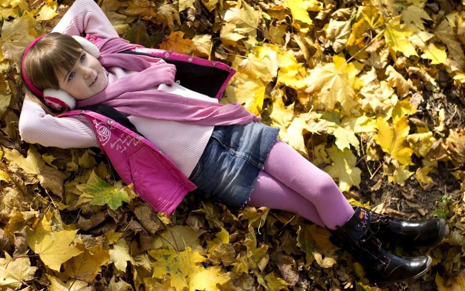 Little Girl on the Yellow Autumn Leaves - 1920x1200