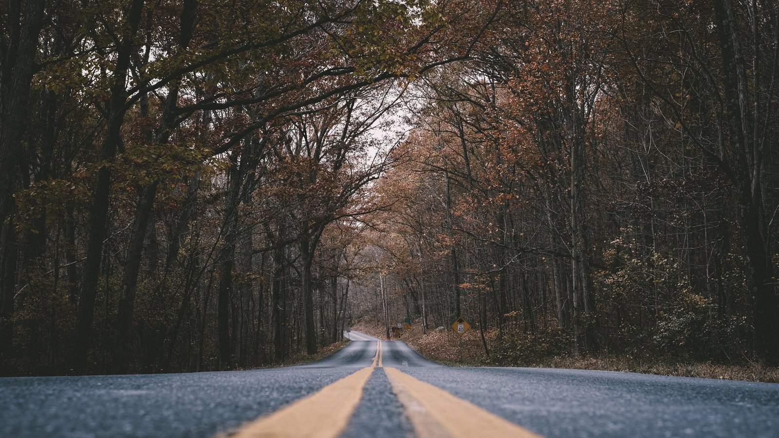 Road Marking and Trees in Old Autumn Forest - 2560x1440