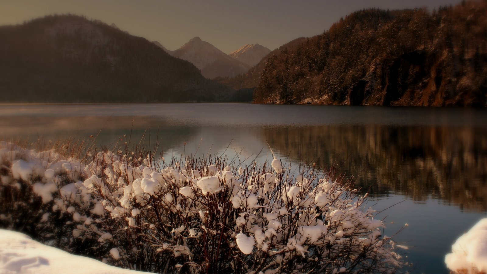 Snowed Bushes and Winter Forest with Lake - 1920x1080 (1080p)