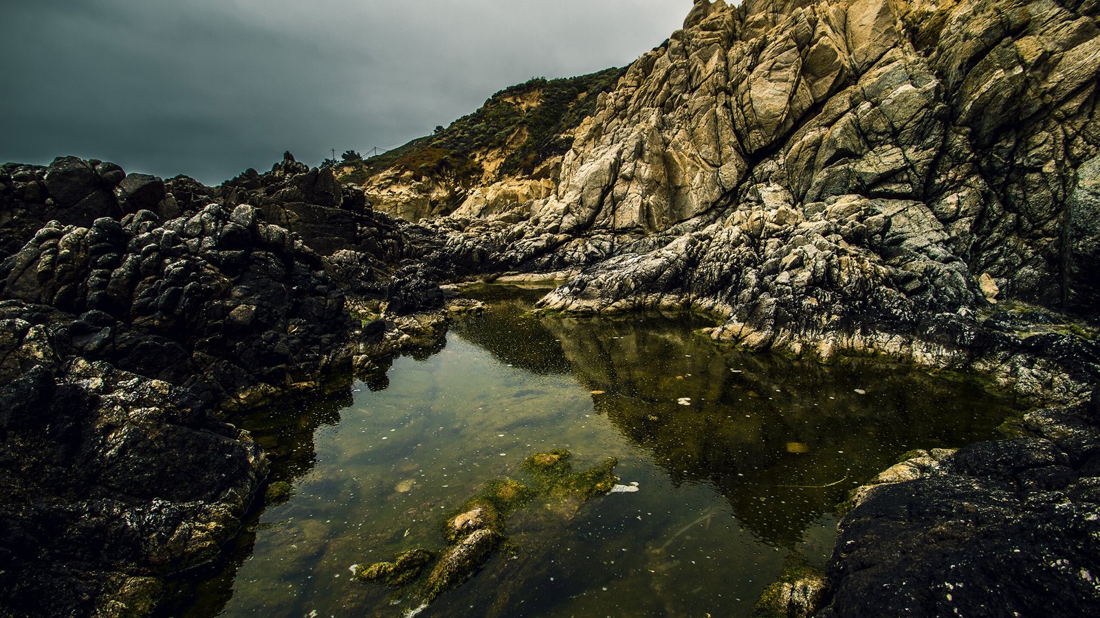 Stone Beach with Water and Village - 2560x1440