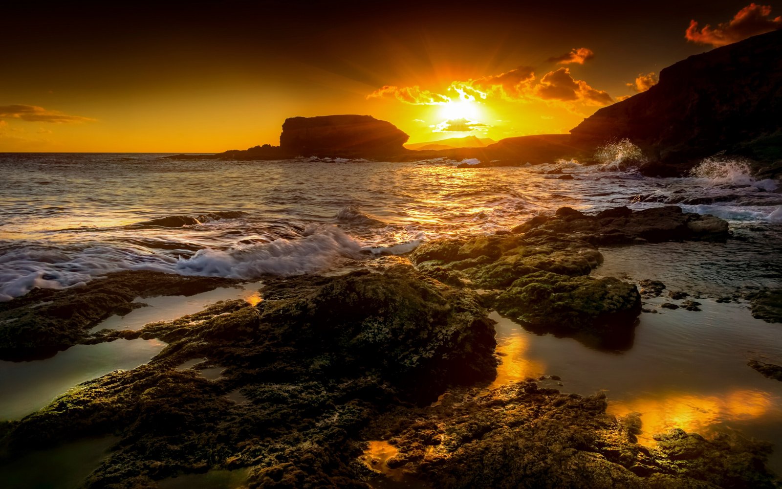 Sunset Beach Waves Water and Red Sun - 2880x1800