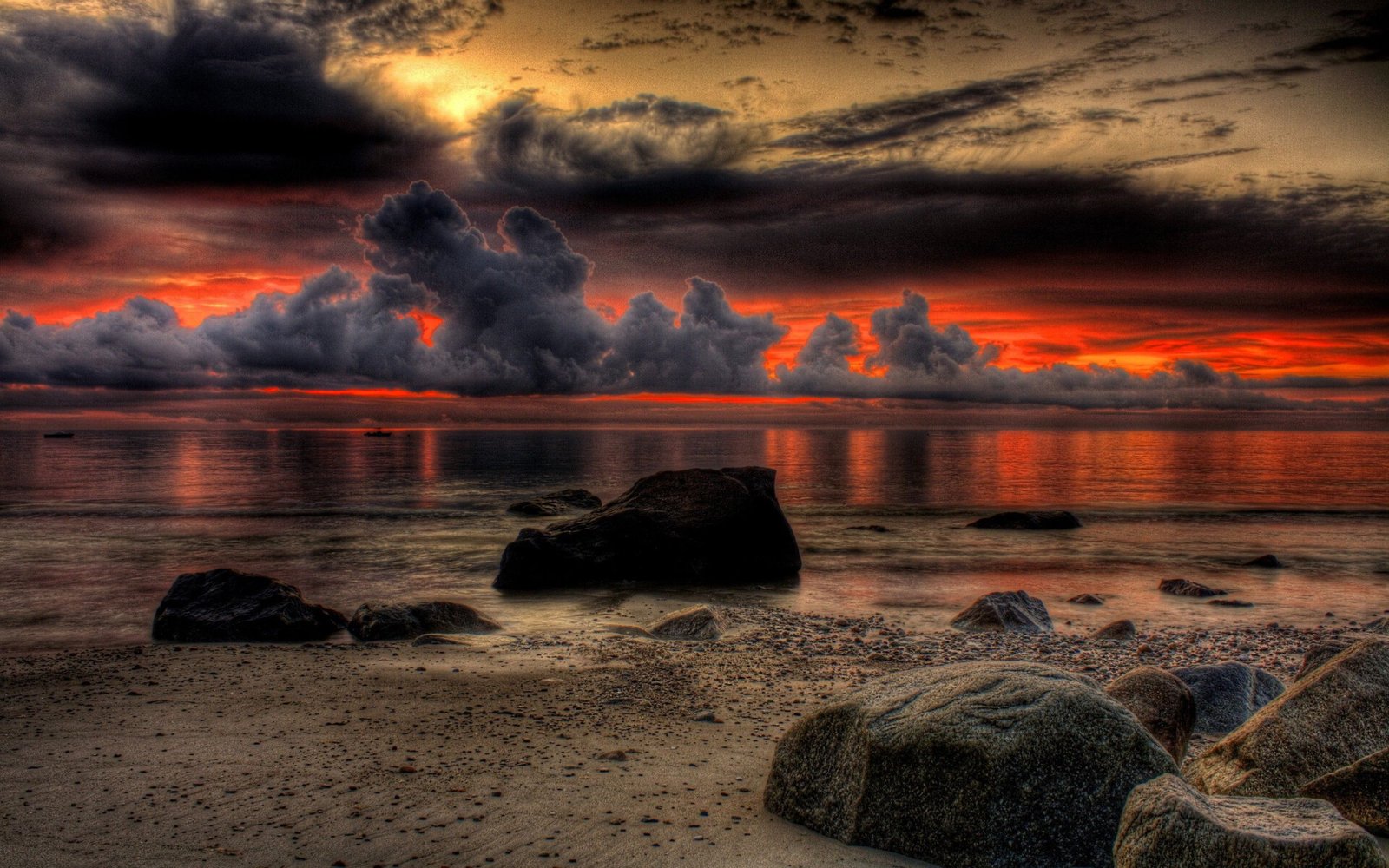 Wonderful Red Sunset and Rocks on Coast - 1920x1200